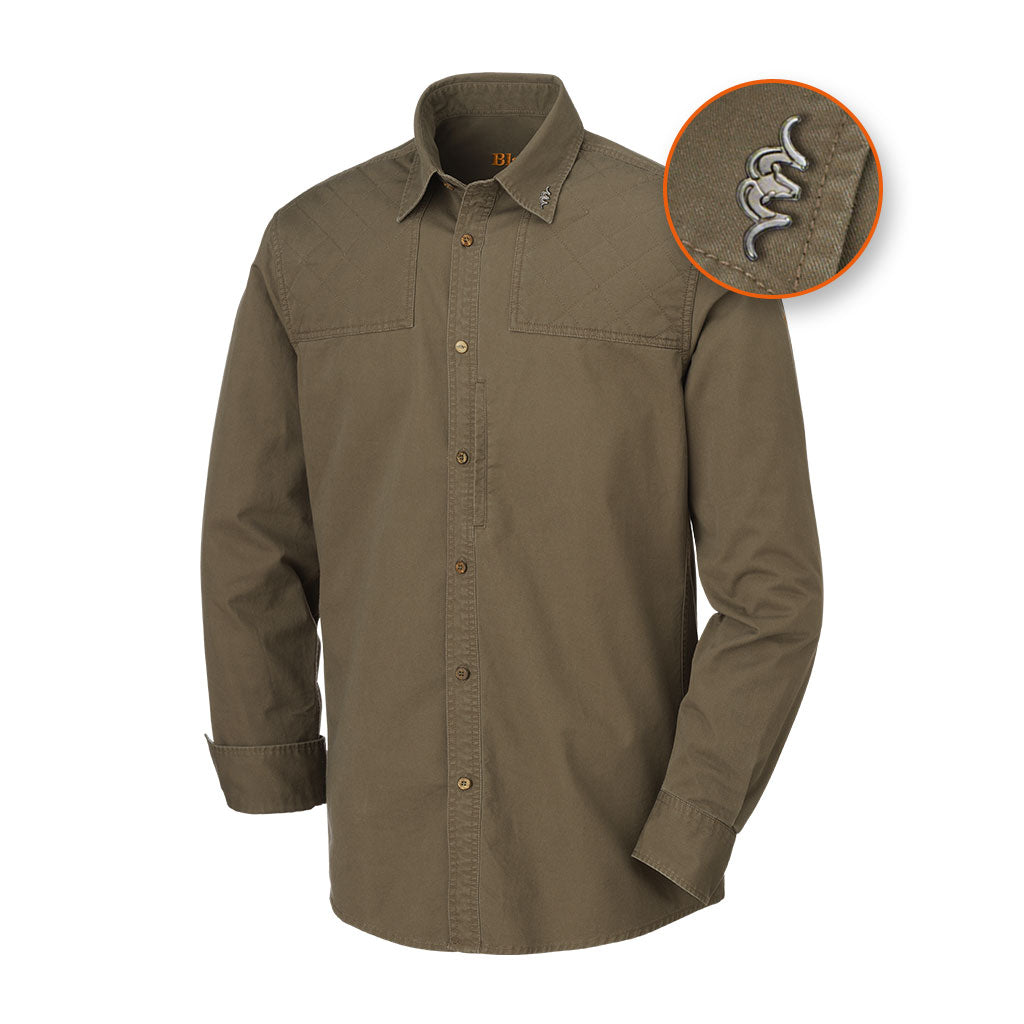 Camisa de trabajo tono-sobre-tono de moda hecha de tela de sarga resistente con elegantes detalles: el ribete ligeramente acolchado en el pecho y las mangas, elegantes botones de coco y el metal decorativo ARGALI en el cuello le dan a la camisa ese toque especial. Adicionalmente, con bolsillo frontal vertical, puños ajustables y ARGALI bordado.