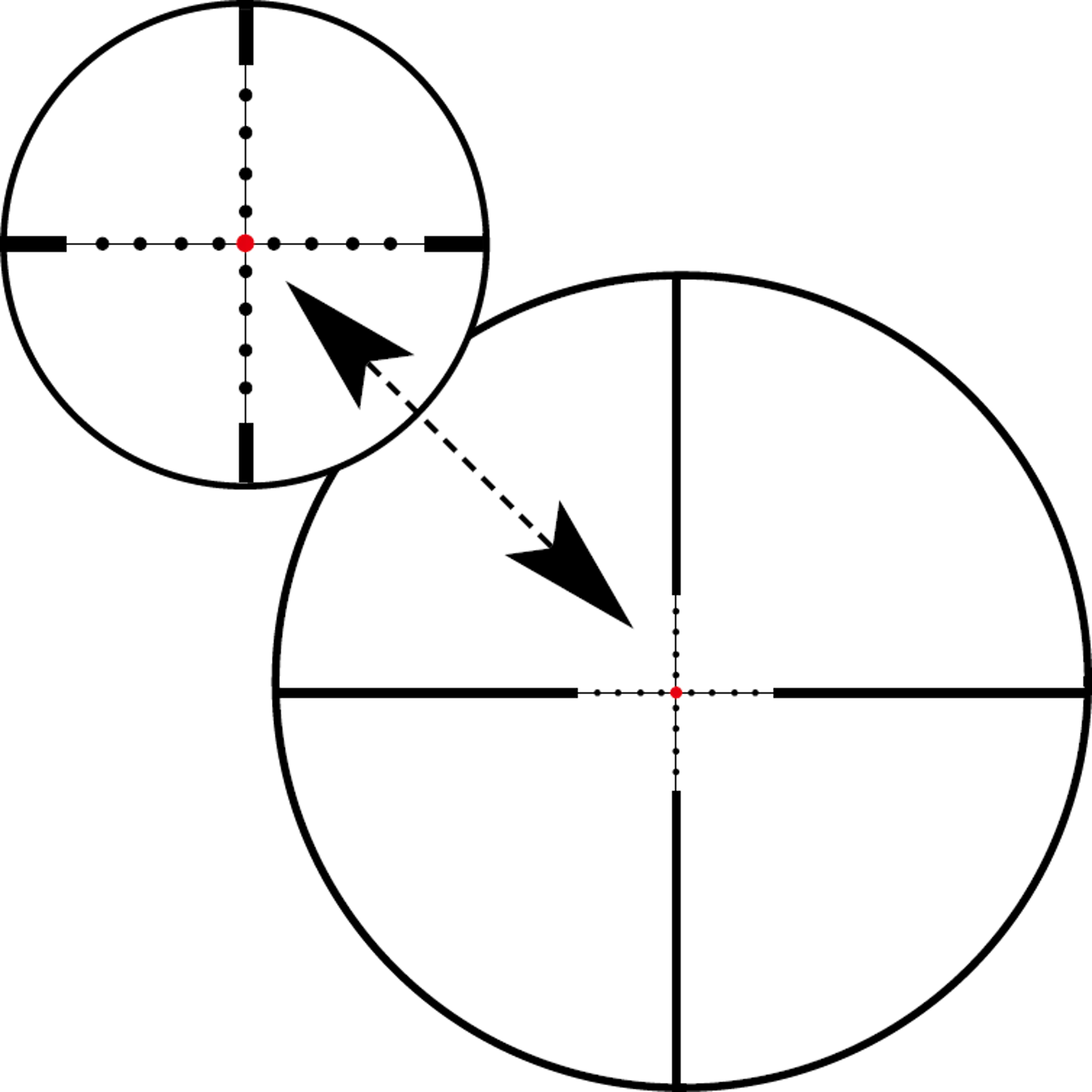 Nuestra retícula clásica para disparos rápidos y largos combinada con el punto iluminado más fino. En el aumento de referencia del visor de puntería correspondiente, los puntos característicos de la retícula se encuentran separados exactamente 10 cm a una distancia de 100 m, por lo que es extremadamente fácil estimar de forma precisa las distancias. En este aumento, el ángulo entre los puntos es de exactamente 1 milirradián, lo que permite a los tiradores experimentados determinar con rapidez el punto de blanco adecuado a distancias largas. La retícula está situada en el segundo plano de la imagen del visor de puntería. La aplicación ZEISS Hunting se puede usar para determinar de manera rápida y precisa el cambio en la medida de cobertura y los valores resultantes de la caída del proyectil y de la corrección de la desviación por el viento para prácticamente cualquier tipo de munición.