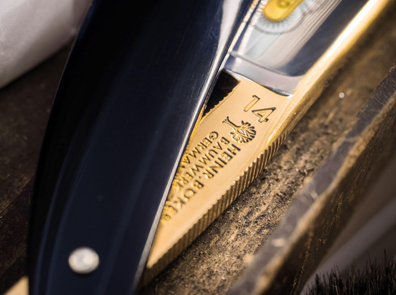 Mientras que las navajas forjadas y el clásico afeitado en húmedo están experimentando un renacimiento, las auténticas espadas anchas siguen siendo escasas. Por primera vez en décadas, quizá incluso siglos, las navajas de 8/8 pulgadas de ancho vuelven a estar en nuestro surtido. En los tiempos en que estas poderosas hojas eran aún más comunes, las navajas de 8/8 pulgadas de ancho con cabezal recto se llamaban 14s. Esta marca se estampaba en la espiga de la hoja antes de endurecer las hojas forjadas. Nosotros no pasamos por alto esta característica especial y también la implementamos en nuestra Böker 14. La hoja de 8/8 pulgadas de ancho no sólo lleva un grabado histórico de la hoja con dorado parcial, sino también un dorado en el lomo y la espiga, que está elegantemente decorado con una filigrana y un detallado grabado láser. El pulido completo de la hoja y el dentado a ambos lados de la espiga redondean las características de este cuchillo. También hemos utilizado modelos históricos como base para el material utilizado para el mango. El mango de acrílico oscuro ligeramente transparente se integra armoniosamente en el conjunto gracias a la sutil incrustación de latón. La hoja está afilada extra hueca con reborde. Con auténtico sello Boker en el paso de la hoja, certificado de autenticidad y noble expositor flotante. Hecho a mano en la fábrica de cuchillos Boker Solingen.