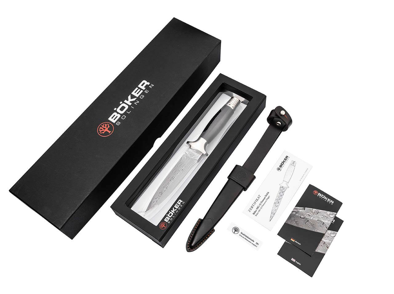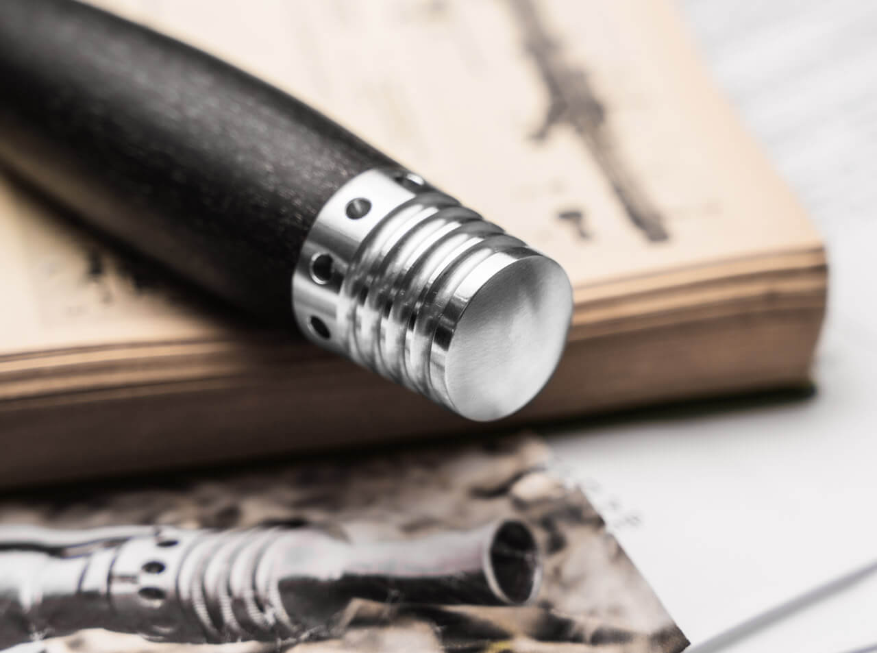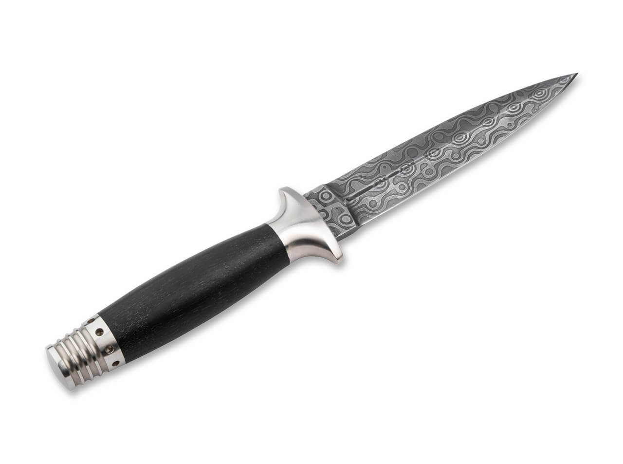 El toggle y el pomo de la daga están fabricados en acero inoxidable macizo. En el pomo se han incorporado como elemento de diseño las aletas de refrigeración y las salidas de gas del amplificador de retroceso (en realidad, un componente combinado con las funciones de amplificador de retroceso, apagafogonazos y manguito guía del cañón). No obstante, aquí también la forma se ha adaptado a la función, ya que las ranuras aumentan el agarre de la daga en la empuñadura inversa. El toggle y el pomo sujetan sin juntas el rollo de madera de carpe con forma de cañón, que se centra automáticamente en la mano gracias a su forma. La daga está equipada con una funda de alta calidad fabricada en cuero marrón oscuro con una presilla para el cinturón y un refuerzo en la zona de la empuñadura. Se suministra con un elegante estuche con marco para una presentación que parece flotar, certificado de autenticidad y número de serie individual.