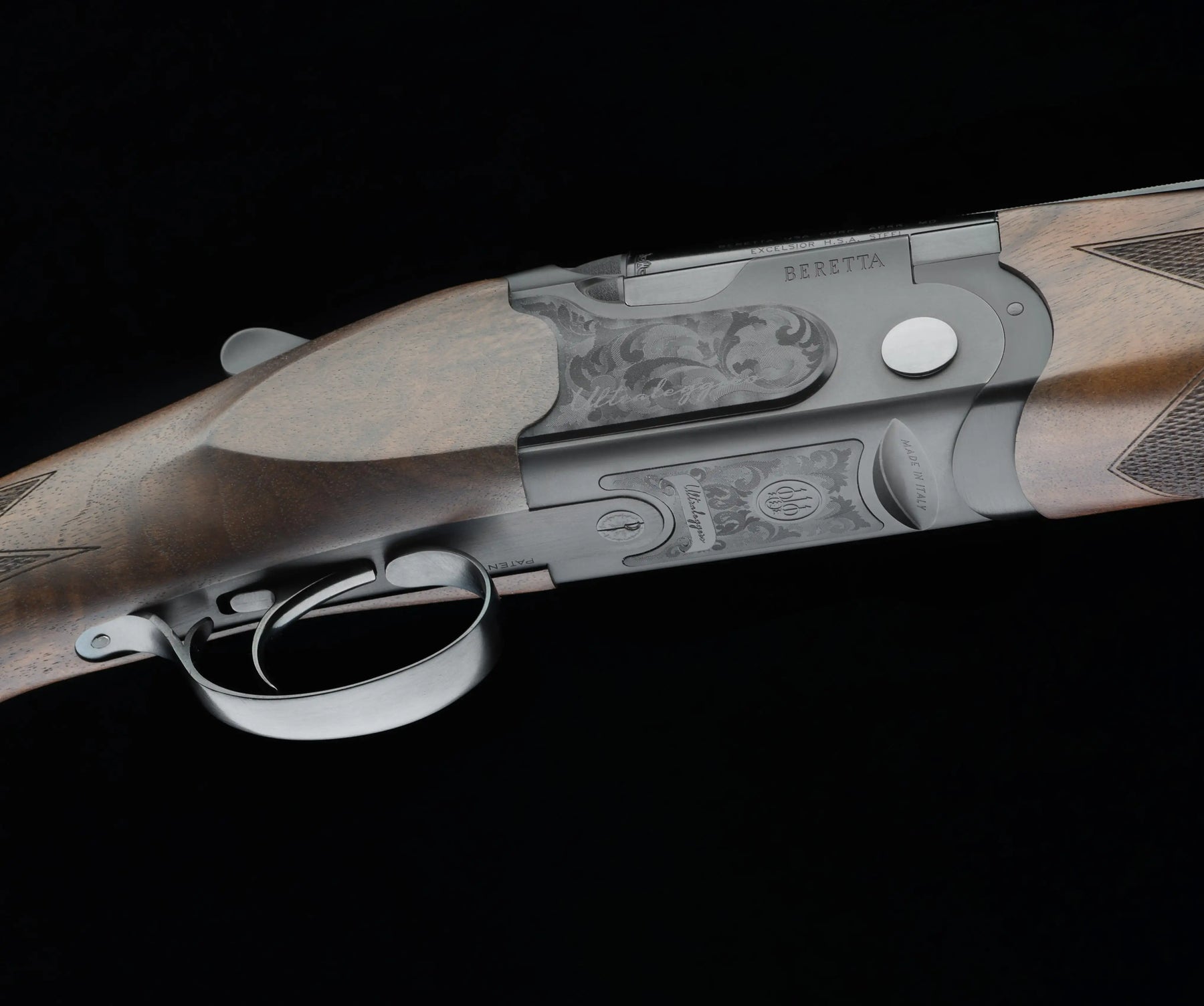 The classic Beretta overlay scale is universally known for its slender and elegant silhouette: it is characterized by the proven closure system with the iconic trapezoidal shoulders and the double tapered pin; The sides and bottom of the scale have been hollowed out, leaving only the amount of metal really necessary to guarantee the reliability and resistance of Beretta. Special technopolymer inserts have been made for the hollowed-out areas of the scale, obtained thanks to ultra-modern technology, which creates special angles on the surface capable of simulating the visual effect of light reflectance typical of engravings on steel.