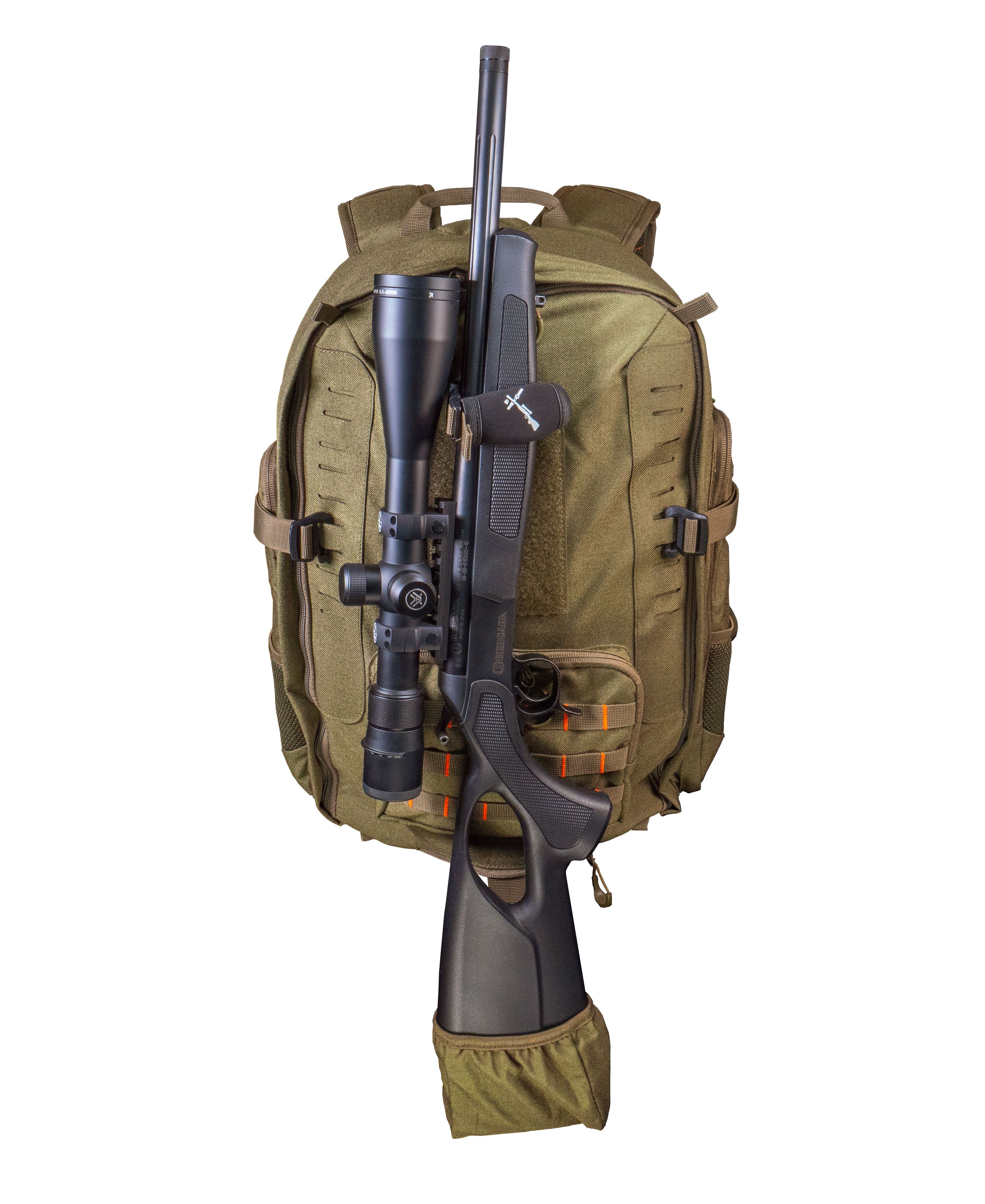 It has a system to transport the rifle safely on rough terrain, being able to hold it at the top by means of the neoprene-lined strap to protect the barrel and below by means of a small bag for the butt.