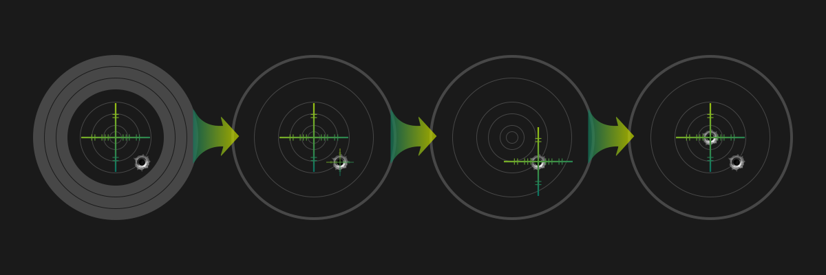 Zeroing of the scope by marking the offset on the reticle after the first shot. Five zeroing profiles are configurable for different distances.