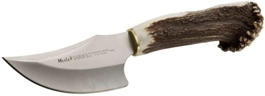 The Muela Sabueso-11A Knife, made of 440 steel, is the typical quality skinner. With a very wide, short and highly curved blade, it is 11 cm long. The handle, made of quality deer antler, is very well worked, and has the perfect size. brass finials, accompanied by leather sheath.