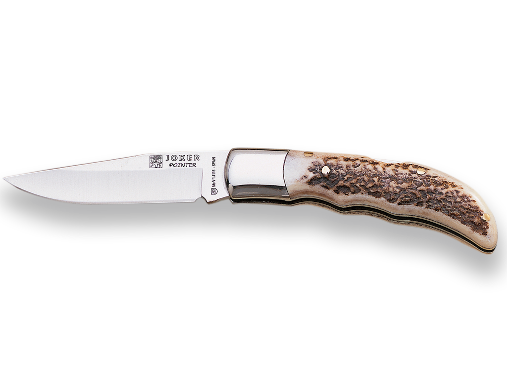 Joker "Pointer" NC09 pocket knife, stainless steel ferrule, 8 cm MOVA blade, deer antler handle, fishing, hunting, camping and hiking tool with the following characteristics: