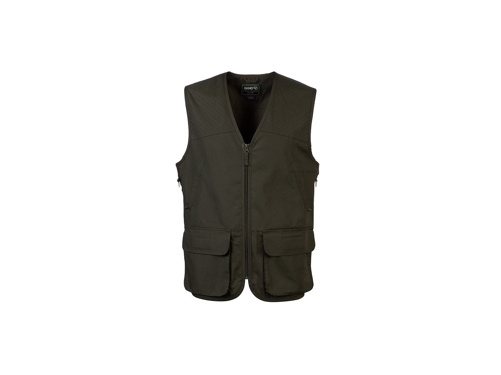 Hunting vest with waterproof back pack. It has two large front pockets to store cartridges, with its Velcro flap fastening system to facilitate removal. Chest pockets with zippers.