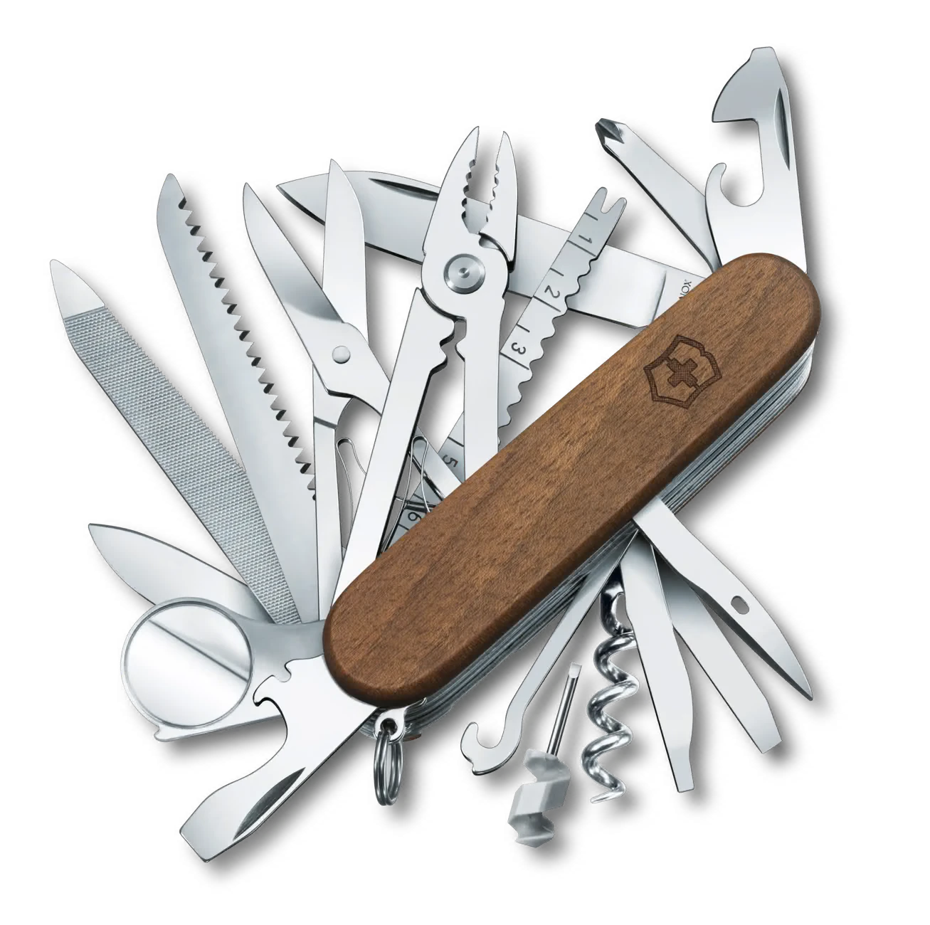 Hoja pequeña / Hoja grande / Sacacorchos / Abrelatas / Destornillador 3 mm / Destapador / Destornillador 6 mm / Pela cables / Punzón, escariador y aguja de coser / Anilla / Pinzas / Palillo de dientes / Cordón