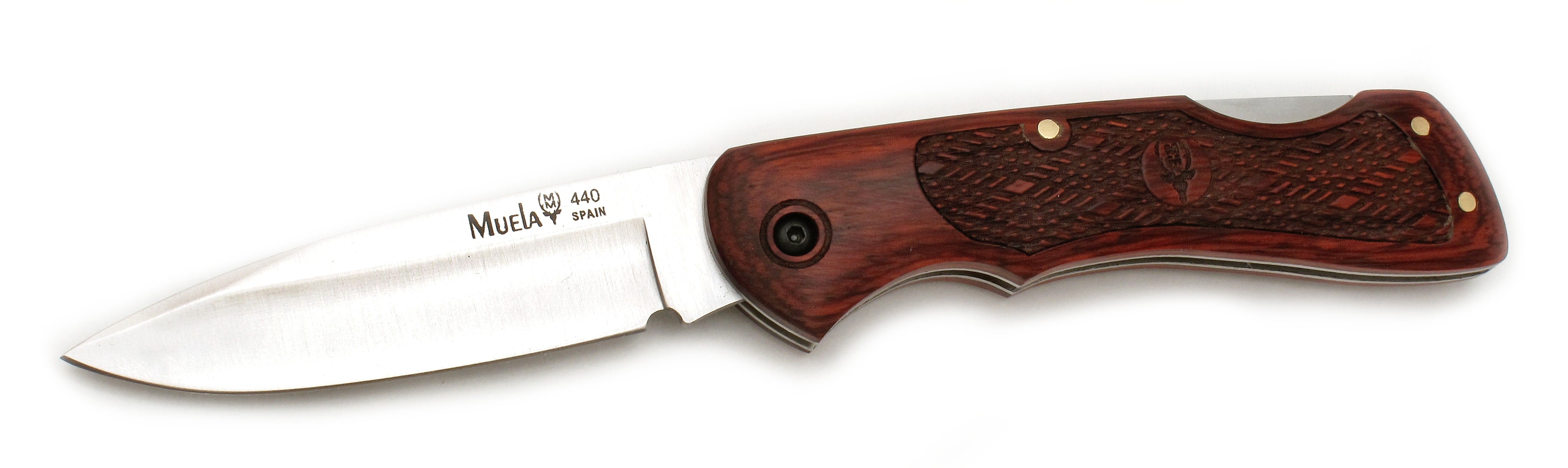 Navaja española Muela con hoja fabricada en acero inoxidable 440. Bloqueo Back Lock y cachas fabricadas en madera prensada coral tallada. Incluye funda de cordura de color negro.